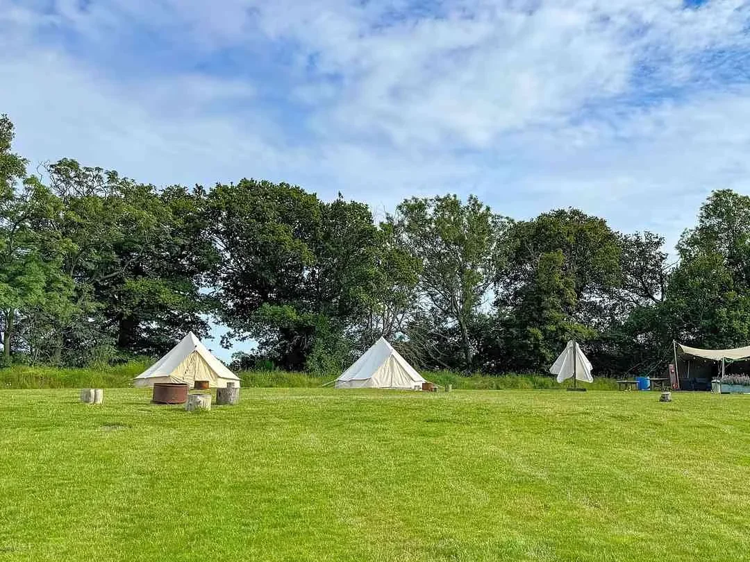 Accommodation includes 10 fully furnished bell tents, as well as plenty of space to pitch your own tent or bring a campervan. The campsite is beautifully maintained, with hot showers, flushing loos, and a welcoming communal space at its heart for socialising and relaxing.